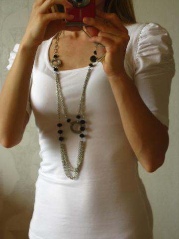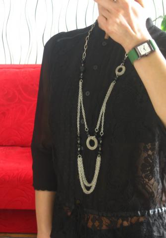 Nenešiotas, labai gražus ilgas kaklo vėrinys, foto neišeina perteikti jo grožio. Visas iš grandinėlių ir juodų, korio pavidalo burbuliukų. Abu žiedai taip pat susukti iš smulkios grandinės. Realybėje gražiau, gyviau atrodo. Mainų nesiūlyti. Vilniuje galima pasižiūrėti, pasimatuoti