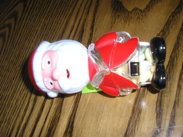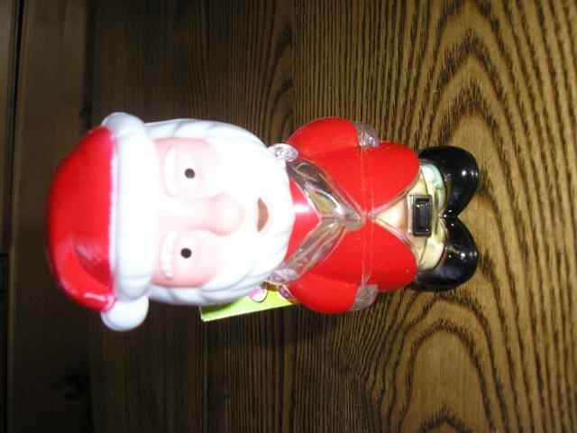 Naujas Kaledu senelis, aukstis 10cm. Gale galvos spaudant mygtuka cipsi.
