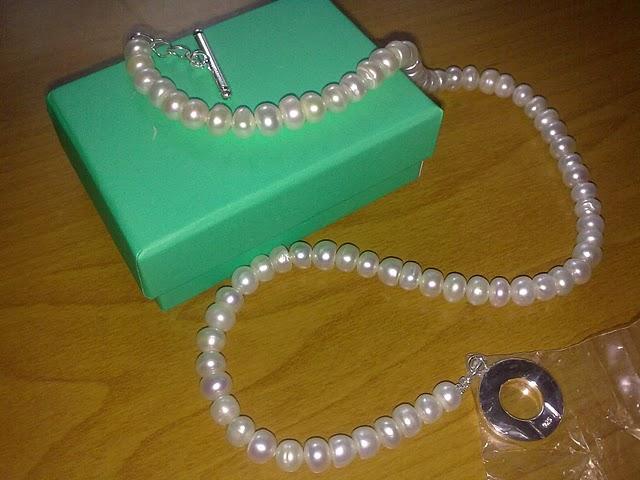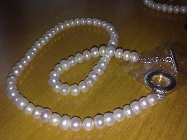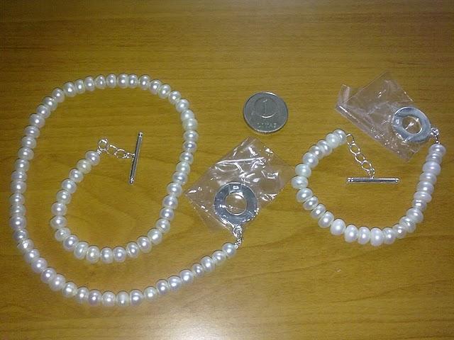 Naujas komplektas su naturaliais perlais - karoliai ir apyrankė. Užsegtuvai yra iš sidabro (prabos yra). Dovanų dėžute. Apyrankės ilgis: 20cm. Karolių ilgis: 45,5cm. Perlai 100% yra natūralus, komplektai nupirkti Kryme. Tel.: 860560058