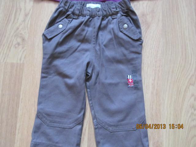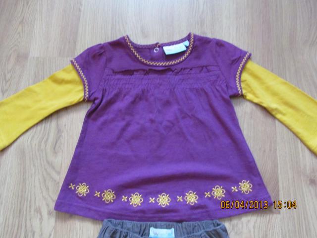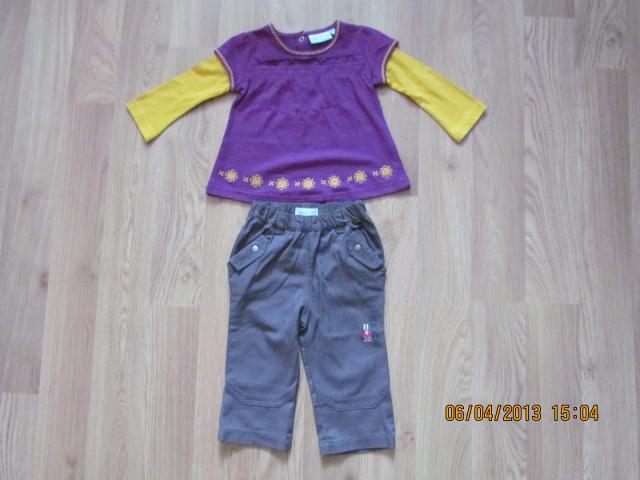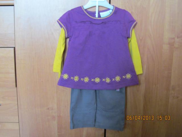 Visiškai naujas kompletėlis Tricky Tracks. Kelnytės su kišenėmis - priekyje dvi ir gale viena, juosmuo su gumute ir yra kilputės dirželiui. Palaidinukė gale užsisega dviem knopkutėm. Rankovės kitokios spalvos, tai atrodo kaip atskiras rūbelis. Dydis 80 cm, tinka iki 12 mėn. Išmatavimai netempiant: kelnės: ilgis - 42 cm, plotis per klubus - 58 cm; palaidinė: ilgis - 34 cm, plotis - 58 cm, rankovės ilgis - 27 cm.