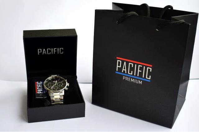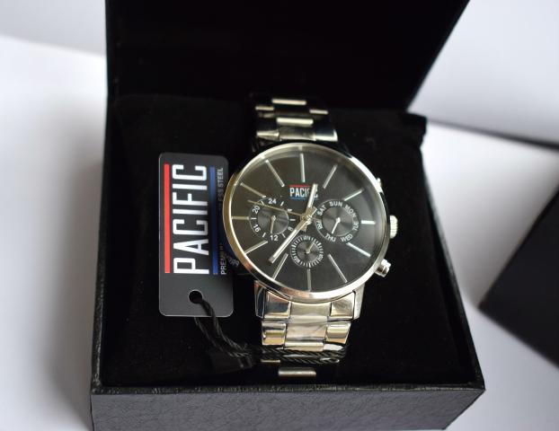 Vyriškas laikrodis Pacific pagamintas iš aukščiausios kokybės sudedamųjų dalių, kurios gaminamos Japonijoje. Šių laikrodžių gamintojai kuria praktiškus, patogius ir kokybiškus laikrodžius. Šio modelio laikrodis turi 3 papildomus ciferblatus, kurie rodo savaitės dienas, mėnesio dienas, bei valandas. Pacific laikrodis puikiai tiks ir kasdienai ir išeigai, taip pat bus puiki dovana vyrui. Dėžutės ir maišelio kaina įskaičiuota į nurodytą bendrą kainą, kuri yra minimaliai derinama. Norint pasižiūrėti gyva