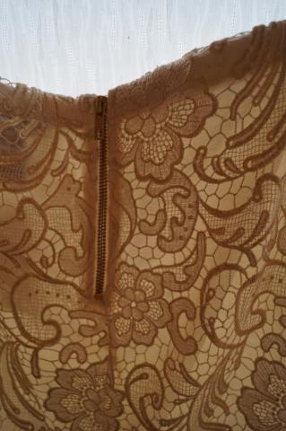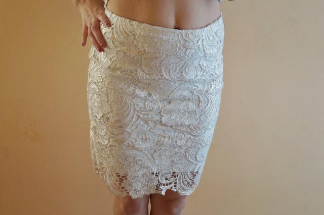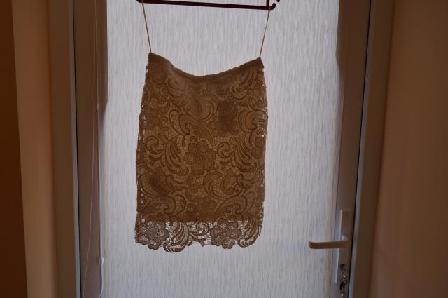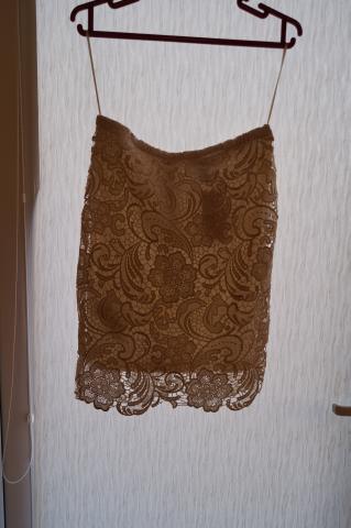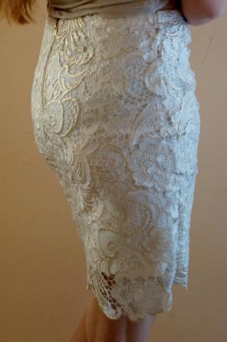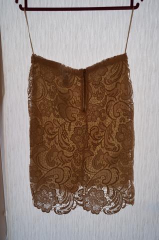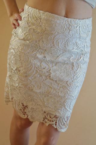 Sijonas su nuostabiais nėriniais, siuvinėtais auksiniu siūlu. Labai puošnus, subtilus. Ilgis 55 cm, juosmuo 36 cm, klubai 43 cm. Pamušalas medvilninis, nėriniai - polisteris.