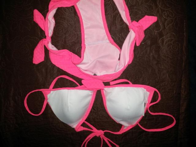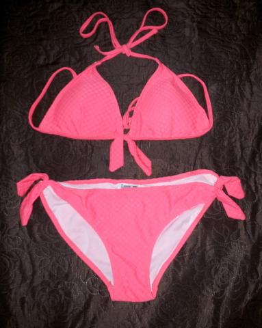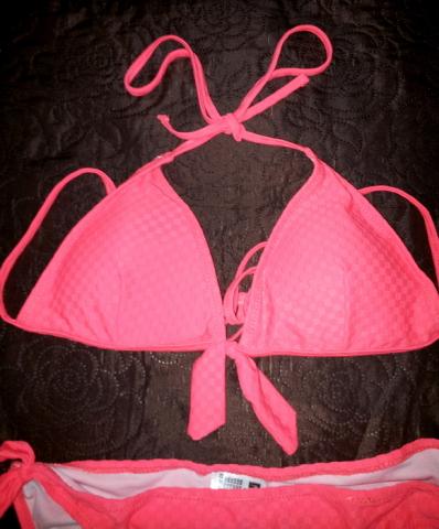 naujas koralinis maudomukas, tinka dydziui s/m, krutinei b, labai dailus, tamprus, sonuose triusikeliu dekoruota kaspineliais.