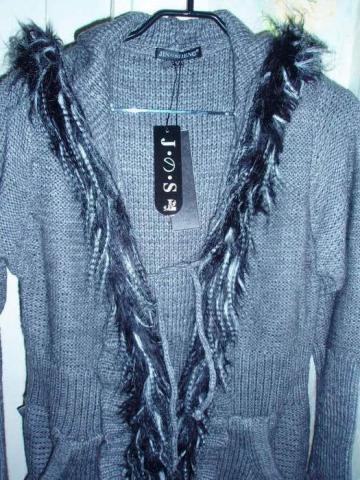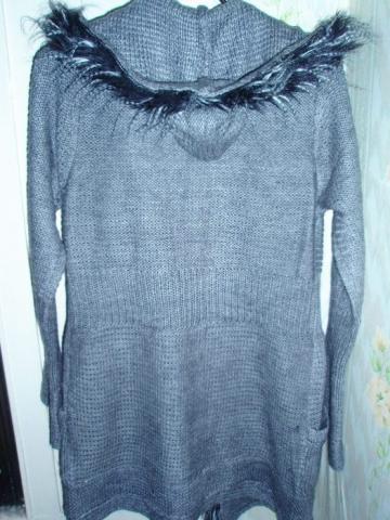 Naujas, pilkos spalvos ilgas megztinis / kardiganas. Su kapišonu, puoštas kailiuku, susiriša šniureliais. S/M dydis. Su etiketėmis.
