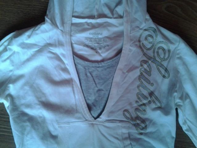 Naujas megztukas, baltas su užrašu. Po apačia yra pilka maikutė, labai gražiai atrodo.
