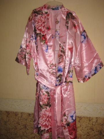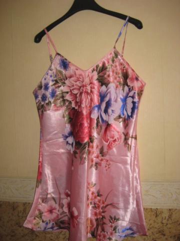 Naujas naktinių komplektas (naktinukai su chalatu) rožinės spalvos. Ilgis 77 cm (nuo petnešelių), chalato ilgis 85 cm.