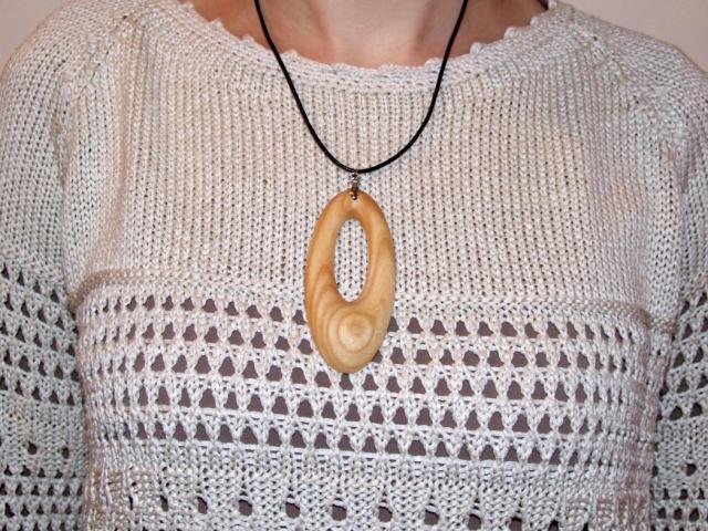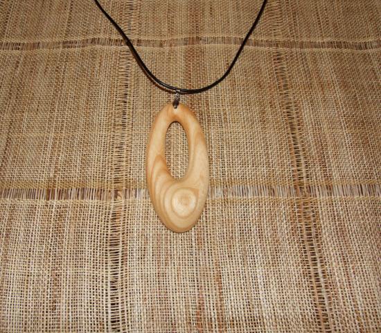 Rankų darbo pakabukas iš medžio, naujas. Pakabuko ilgis 9 cm, plotis per plačiausią vietą - apie 4 cm. Virvelės ilgis - 22 cm, dar apie 5 cm galima pailginti, ilgis reguliuojamas.