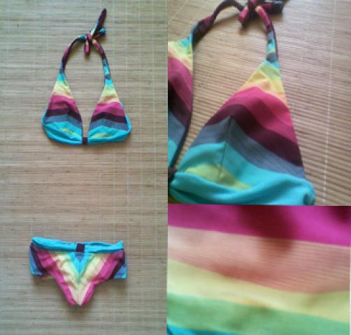 Dryžuotas, spalvotas maudymukas be kaušelių.