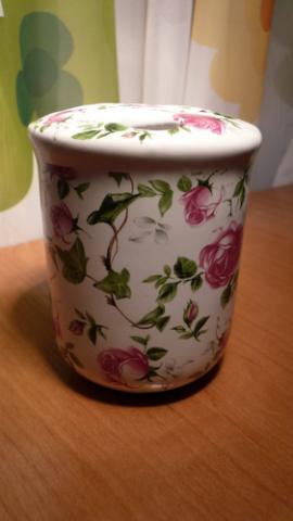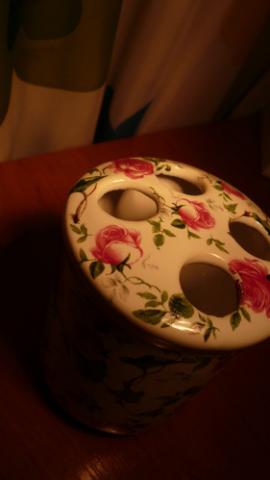 puodelis su 4 skylutėm dantų šepetėliams, puoštas rožytėm ir gebenėm