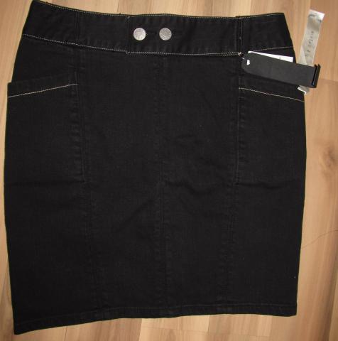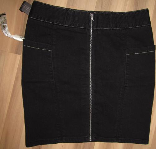 Naujas juodas, dzinsinis sijonas. Sonuose su kisenemis, priekyje uztrauktukas. Dydis raso S/M.