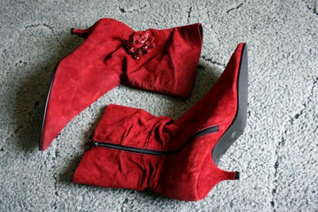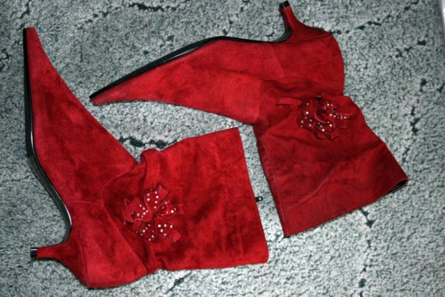 Raudoni zomšiniai aulinukai šone puošti gėle su akutėmis