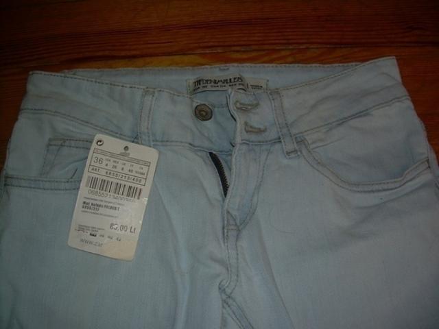 Visiškai nauji "Zara" džinsai. Šviesiai mėlyni, platėja saikingai, vienintelis trūkumas - nėra vienos sagos priekyje (tokius jau pirkau, bet nesunkiai sutvarkoma). Platėjantys, nestori.