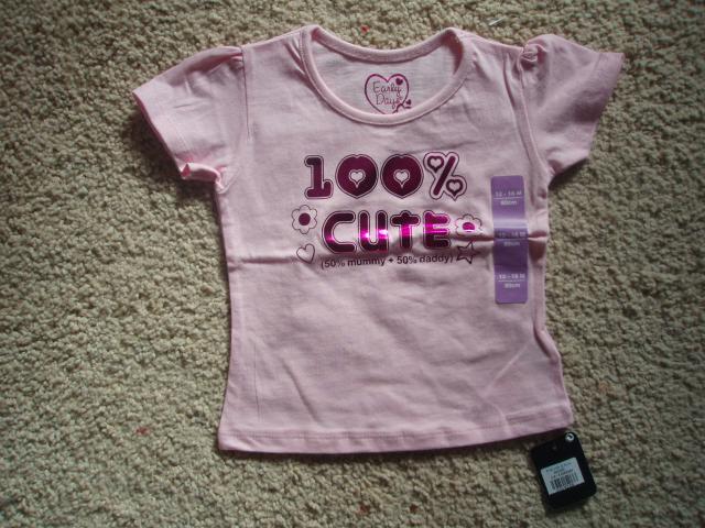 Rožiniai marškinėliai su CUTE užrašu, prie petukų paraukta Dydis: 12-18 mėn. Būklė: Nauja Sezonas: Vasara Prekinis ženklas: Early days Sudėtis: 100% medvilnė Kaina: 12.00 Lt