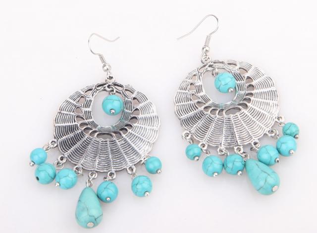 Tibetietiški auskarai, su labai tikroviška akmenukų imitacija. Labai gražūs. Per visą ilgį, nuo užsegimo iki ilgiausio akmenuko apačios 8 cm, plotis 4 cm. Akmenukų spalva nuotraukoje gavosi žydresnė, nei yra iš tikrųjų. Realiai spalva tarp žalsvos ir žydros.
