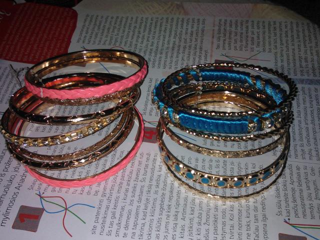 Naujos, nenešiotos apyrankes. Komplektą sudaro 6-ios apyrankės. Paauskuotos, melsva ir persikinė spalvos. Galimas siuntimas į kitus miestus.