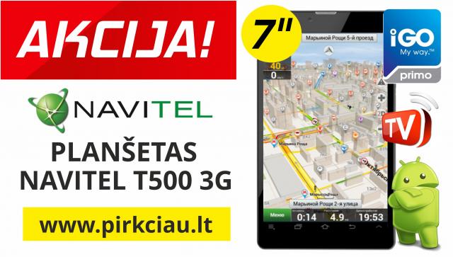 NAVITEL T500 3G + Navigacija+TELEVIZIJA Android OS, 7" ekranas NAVITEL T500 3G 7" - GPS bei planšetinio kompiuterio hibridas. Jame viskas: GPS navigacija, multimedia, bevielis internetas, dvi kameros, Bluetooth, GPS. Galingas 1.3 GHZ procesorius, RAM 1GB, 8GB vietos atmintis. Patikimas, kokybiškas įrenginys. INTEGRUOTA TV - per 500 kanalų! GALIMA ĮDĖTI SIM KORTELĘ! SUDERINTA SU IGO PRIMO (lengviesiems bei sunkvežimiams)+NAVITEL PROGRAMINE ĮRANGA. PRIETAISAS SU 8GB ATMINTIES LAIKMENA, BLUETOOTH, DVIEM KA