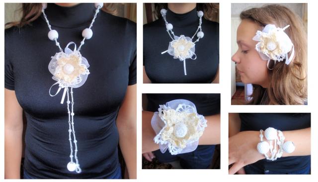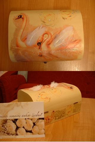 Veltinis, nėriniai, tapyba ant šilko, dekupažas. Unikalūs, originalūs rankų darbo papuošalai, sagės, šaliai, paveikslai, dekupažiniai rankdarbiai, vestuvinė atributika. 1. Sage gele - 40 Lt 2. Dekupazine skrynia jaunavedziams - 50 lt 3. Sampaninis papuosalu rinkinys nuotakai - 50 lt 4. Zalia sage gele - 40 Lt 5. Papuosalu rinkinys - 40 Lt 6. Kaklo papuosalas - 35 Lt 7. Papuosalu rininys nuotakai - 50 Lt