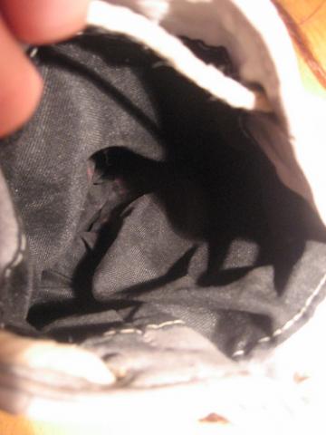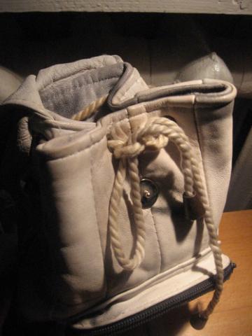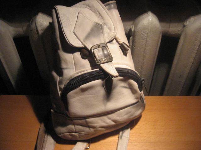 Nedidelė balta odinė kuprinytė su trupučiu pilkai juodų dėmelių (ne ištepta ar dugadinta, o toks audinys)