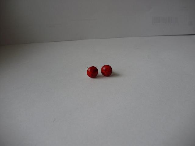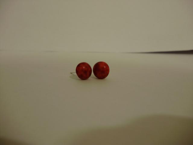 Maži, margi, raudonos spalvos, apvalūs auskariukai. Skersmuo 8mm.