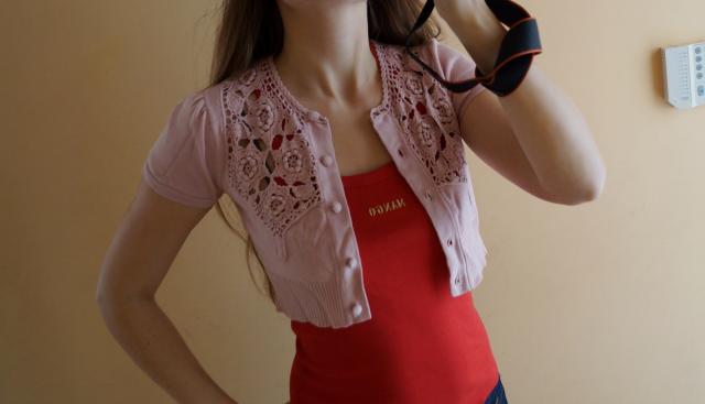 Nepakartojamas bolero. Atrodo kaip naujas, jokių defektų. Ilgis 33 cm, krūtinė 41 cm. 100 proc medvilnė.