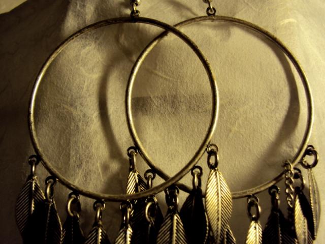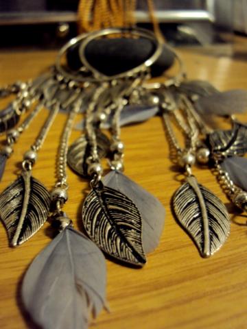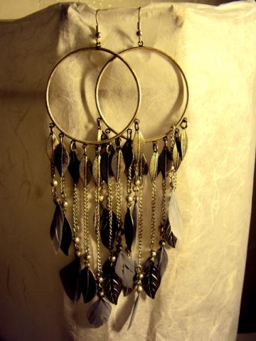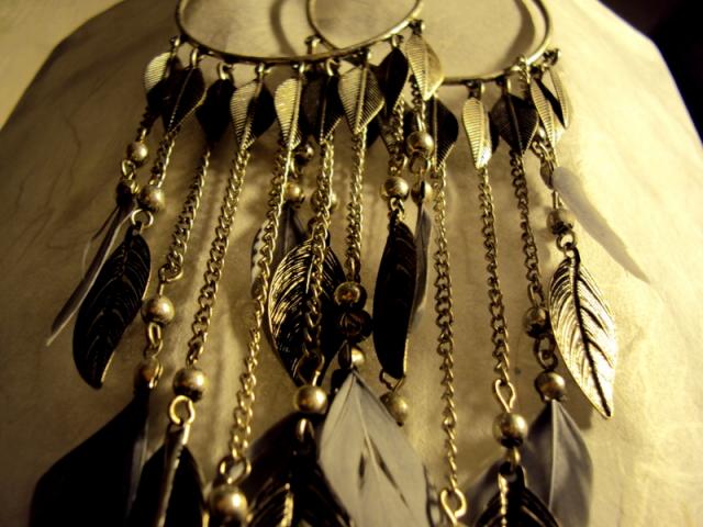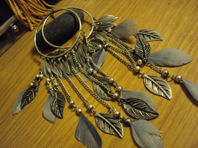 NEREALUS Ilgi,puosnus, ekstrevagantiski ir visada issiskiriantys indenisko stiliaus auskarai, iki peties, puosti pilkomis plonksnelemis, bei metalo plunksnu imitacijomis... Su jais atrodysite pritrnkiamai