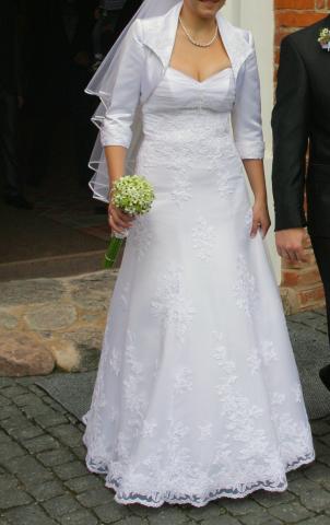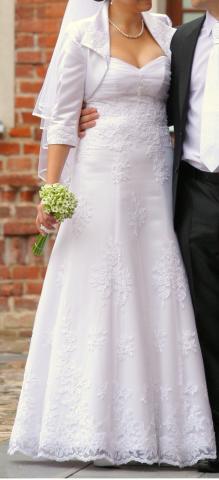 Parduodama nėriniuota, balta vestuvinė suknelė, dekoruota kristalais ir karoliukais. Labai patogi, nes be šleifo, nugara varstoma, ūgis 173 cm. Siūta pagal Maggie Soterro Vogue modelį.