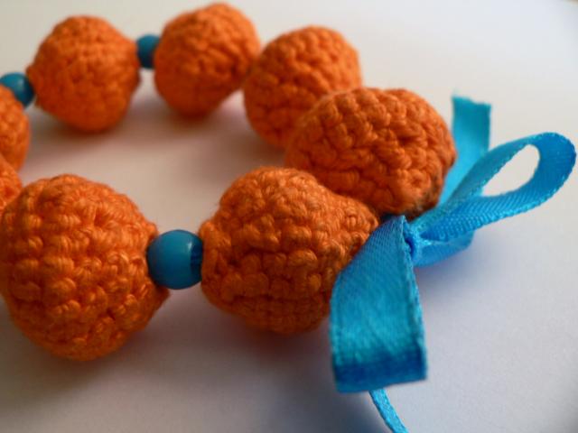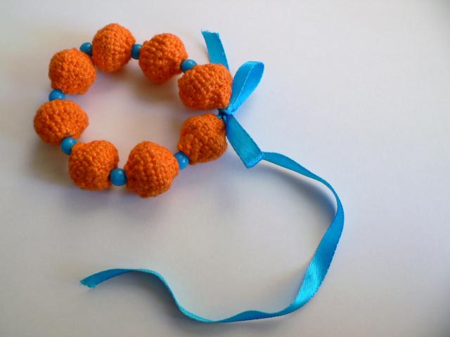 Oranžinė nerta rankų darbo apyrankė su žydrais plastmasiniais karoliukais tarpuose. Suverta ant žydro kaspinėlio. Originali.