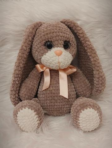 Iš pliušinių Himalaya Dolphin Baby siūlų nertas kiškis. Užpildas - PES pluoštas. Saugios akytės ir nosytė. Dydis apie 33 cm (be ausų). Sėdinčio - 23 cm.
