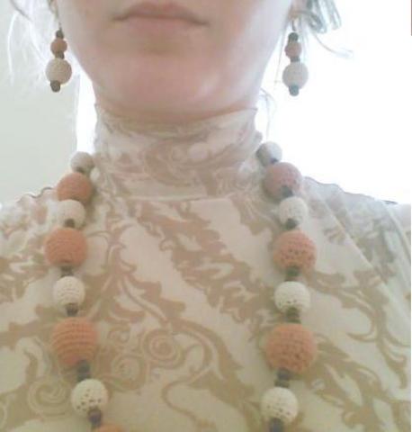 Nerti karoliai ir auskarai, su mediniais rutuliukais. Ranku darbas.