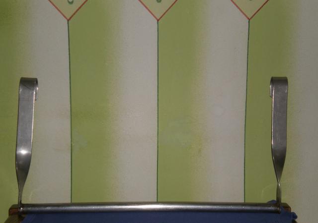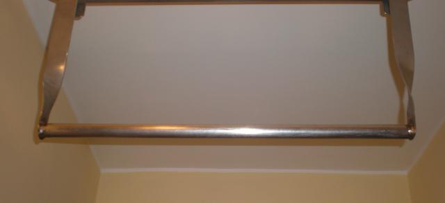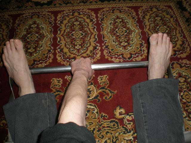 Gamintas pagal uzsakyma. Is nerudyjancio plieno (nerzaveikos). Galima nestis ten kur patinka. Ant kokio auksto vamzdzio, medzio, ar aukstu duru virsaus. Galima daryt prisitraukimus, kabeti, ar tiesiog daryt tamprumo pratimus ziurint televizoriu (kaip parodyta 5,6,7 foto). Reikia atsisedus ant kilimo pedomis isispirt i strypa, istiest kelius ir abiem rankom (foto matoma viena ranka, nes antra laiko fotika), temptis i prieki. Labai naudinga ta pratima daryt ziurint TV.