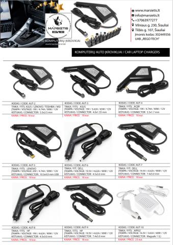 VISI Nešiojamų kompiuterių mašininiai pakrovėjai Pristatymas visoje Lietuvoje per 1-2 d.d. (DPD kurjeriu, paštomatu, paštu, galima atsiimti vietoje). Suteikiama garantija 12 mėnesių. Visa konsultacija, remonto darbų užsakymas: +37063977277 / info@marsietis.lt / Vilniaus 230, Šiauliai arba Tilžės 107, Šiauliai Daugiau informacijos: www.marsietis.lt 1. (AUT-1) UNIVERSALUS 90W | 16 ANTGALIŲ+USB automobilinis kroviklis. Kaina 29 eur. 1. 19V 4.0x1.35mm ASUS 2. 16V 5.5x2.5mm IBM LENOVO ASUS 3. 18.5V 4
