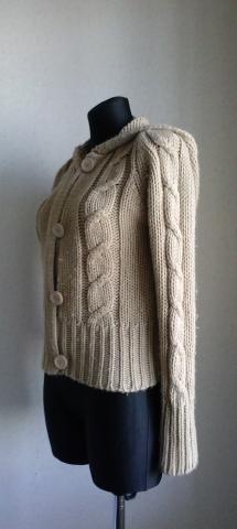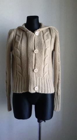 Šiltas New look megztinis su kapišonu. Tamposi. Užsisega užtrauktuku ir sagomis. Dydis 40 Ilgis 54cm Rankovės ilgis 65cm Krūtinės apimtis 50cm Pečiai 33cm Liemuo 44cm Sudėtis 100% akrilas
