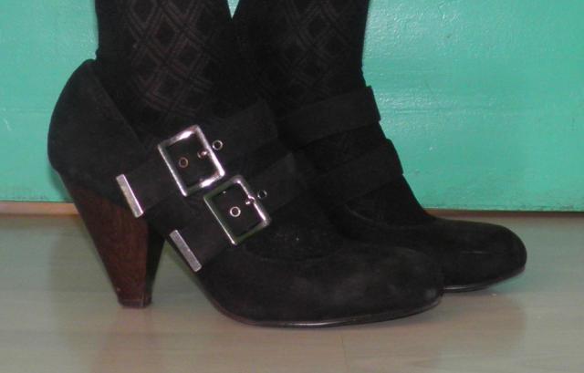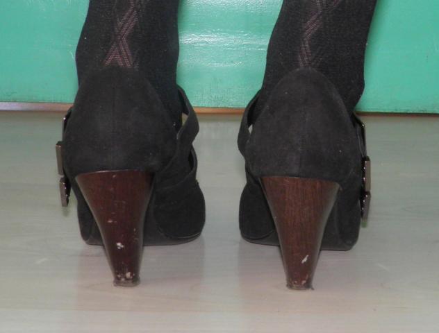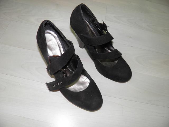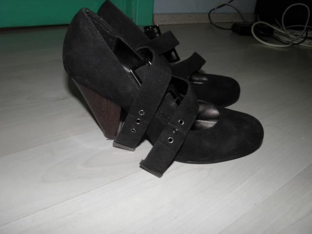 juodi aukštakulniai, iš priekio su dirželiais dviem susisega. Paskutinėe foto matosi defektai, jau kulnai apdaužyti šiek tiek, bet nešiojant kur nors tai tikrai nekrenta į akis.