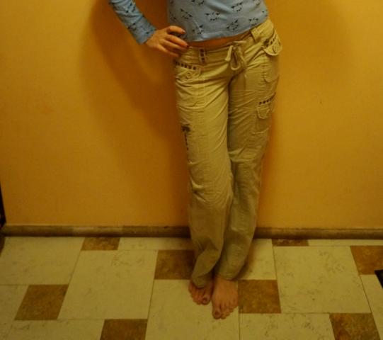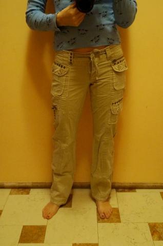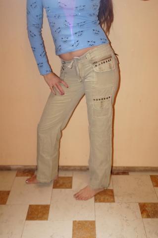 Labai smagios, patogios laisvos laisvalaikio kelnės. Smėlio spalvos, Daug visokių akcentų: kišenių, užtrauktukų, šponkių, siūlių, pabrizginimų. Tikrai labai patobios. Apačioje galima susitraukti gumute plotį. Dydis XS, laisvai tiks is S. Išmatavimai: 97 cm ilgis, juosmuo 39 cm x 2, klubai 46 cm x 2.
