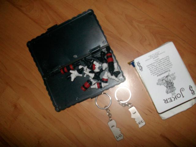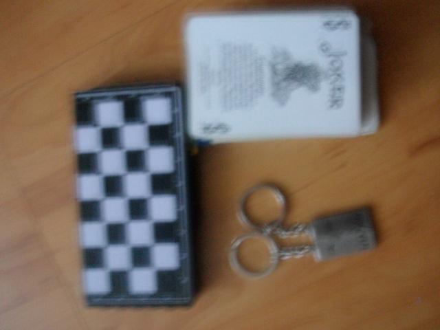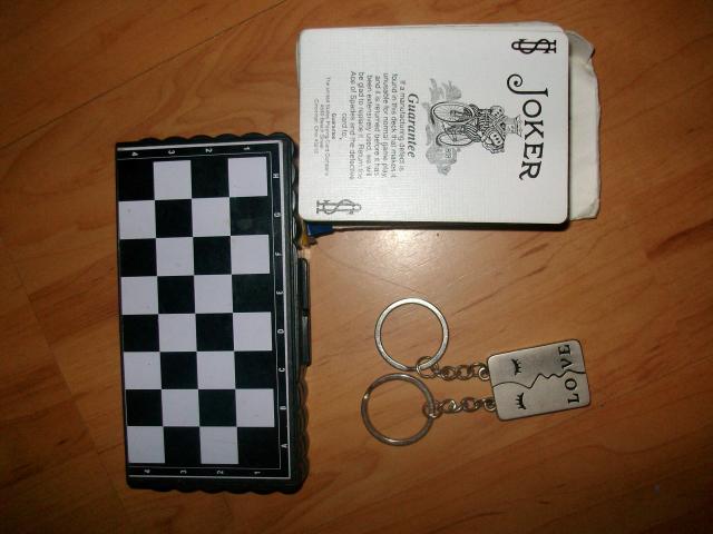 kaip matote, klauskite ? mini saskes su sachmatais, amerikietiskos kortos visa kalade, tik dezute ju paplysusi, raktu pakabukas " Love " su magnetukais, raktu pakabukas kiauliukas, Du raktu pakabukai prozektoriukai, vienas melynai sviecia, o kitas nesviecia pasibaigia elementai...