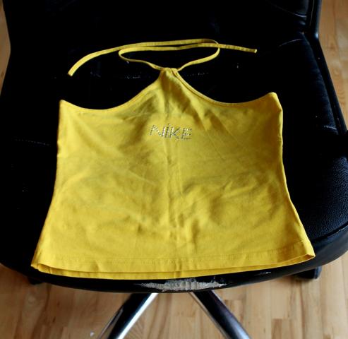 Ryškiai geltona Nike maikutė perrišama per kaklą. Etiketė nukirpta, bet dydis turbūt apie XS/S