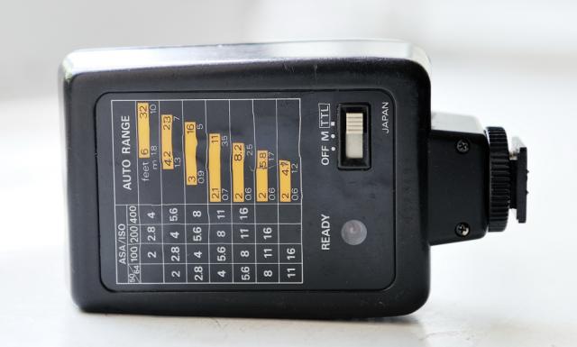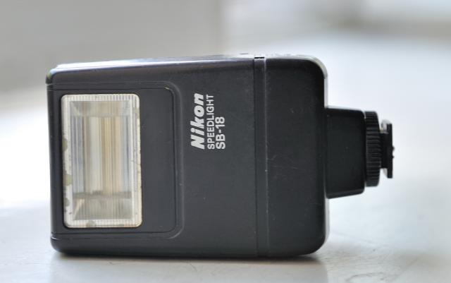 Veikianti blykstė Nikon speedlight SB-18, dedasi 4 AA tipo baterijos.