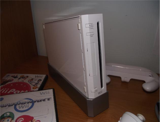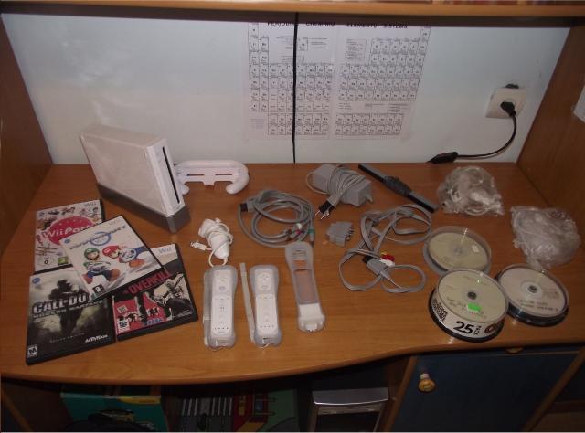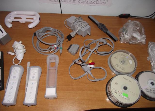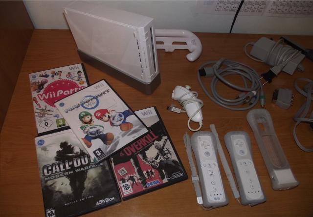 Puikiai veikiantis, atrištas Nintendo Wii kompiuteris. Į komplektaciją įeina: konsolė, konsolės stovas, 2 wii remote pulteliai su silikoniniais dėklais, 1 veikiantis nunchuk pultas, 2 neveikiantys nunchuk pultai (vieną galima lengvai pataisyti, jeigu mokate lytuoti), 1 wii motion plus priedas su silikoniniu dėklu, wii vairas, ginklas (nuotraukose nėra), judesių daviklis, maitinimo blokas, laidai į TV (tulpės), SCART perėjimas į TV, laidai į aukštos raiškos TV, 38 žaidimai diskuose, SD kortelė su programomis