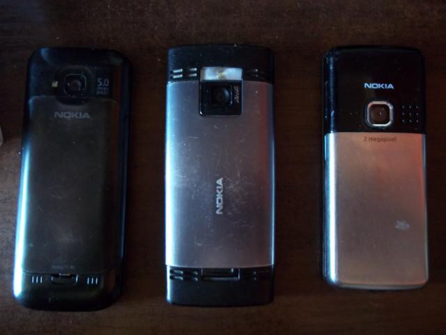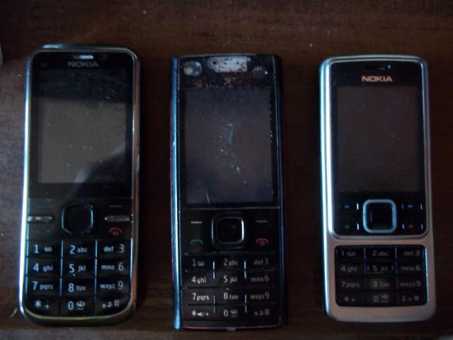 Nokia X2-00 Is isores aptrintas, niekur nenuskeltas. 6/10 Viduje tvarkingas. 10/10 Priedu nera. 5Mp kamera. Kaina 70LT -------- Nokia C5 Viduje tvarkingas. 10/10 Is isores aptrintas. niekur nenuskeltas 8-9/10 Krenta galinis dangtelis. 5Mp kamera Kaina 100Lt ----- Nokia 6300 is isores nesubraizytas. 9/10 Neveikia mikrofonas, nera baterijos. Galima naudoti tik muzikai klausytis, arba tik susirasinejimui. Arba pirkti ant daliu. Kaina 20Lt. ------- VISI TELEFONAI BE PRIEDU Telefonas +370641