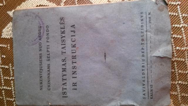 Nukentėjusiems nuo audrų ūkininkams šelpti fondo įstatymas, taisyklės ir instrukcija. Knygutės metai: 1938