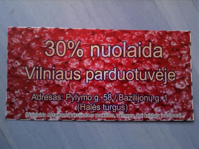 30% nuolaidos kuponas apsipirkti Vilniaus karoliukų parduotuvėje adresu: Pylymo g. 58 / Bazilijonų g. 1 ( Halės turgus ). Labai puikus kuponas, nes neturi galiojimo pabaigos, galiojimas NERIBOTAS! : ) Kuponas TIKRAS ir nepadirbtas ; )