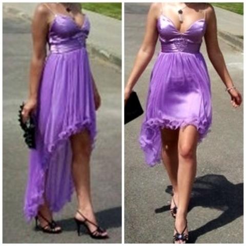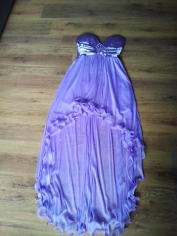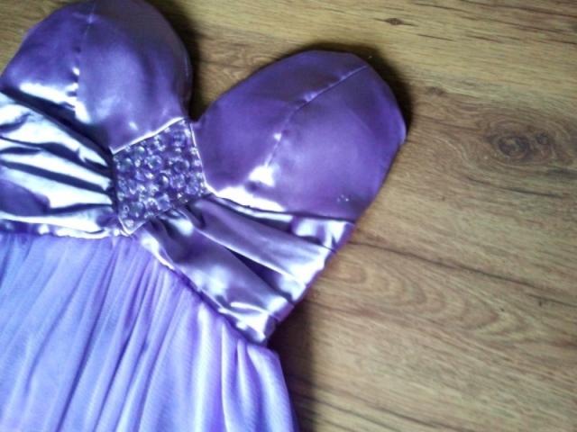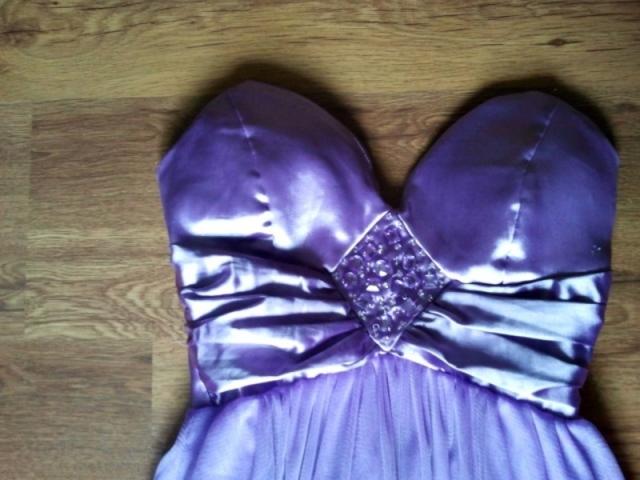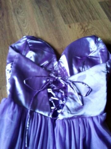 Violetines spalvos progine suknele. Spalva tokia kaip nuotraukoje ant zmogaus. Uzsideta viena karta. Kai pirkau jau buvo su mazu defektuku, keli siuliukai papesti ant kaires krutines. Taciau nesimato, nes dazniausiai ranka uzstoja. O ir apskritai manau jog galima butu juos i vidu itraukti. Taip pat yra kilputes petneselems. Nugaroje pasleptas uztrauktukas ir suvarstoma, todel per krutine galima dydi reguliuoti