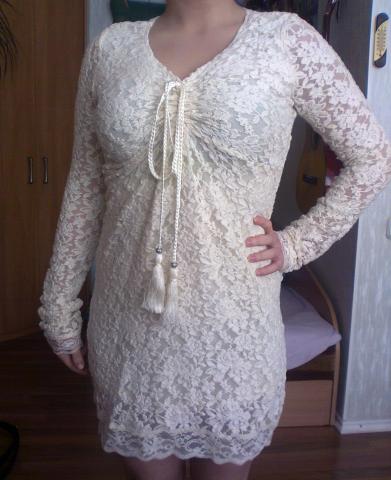 Kremines spalvos visiskai nauja gifiurine suknele. Dydis 38-40 Prie krutines raisteliai susitraukia galima reguliuoti :) Po apacia yra pamusalas todel nepersisviecia.