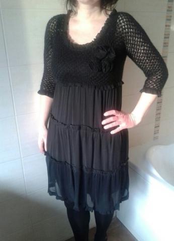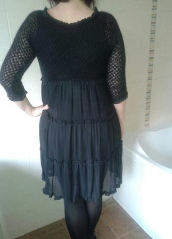 Pirkta' Kateje' moketa virs 200Lt. Nerealiai grazi, bųvau apsirengusi kelis kartus. Virsutine dalis ir rankoves megztos. Rankovese nera pamusalo, todel persisviecia. Ilgis nuo peties 94cm Krutines apimtis 41cm (matuota netempiant) Rankoves ilgis 40cm nuo pazasties