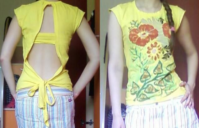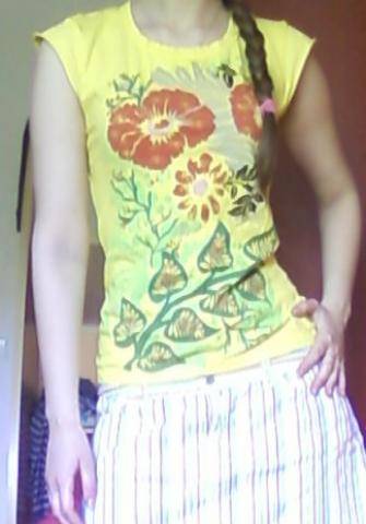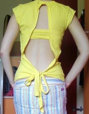 labai grazi, ryskios geltonos spalvos priekyje marginta yvairiomis ryskiomis gelemis, o nugara atvira, susirisa kaspinas,viskas matosi foto :] visai nauja tik kad etikete nuimta, pirkta ne lietuvoje! ;]