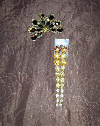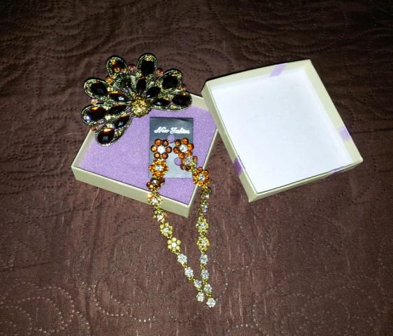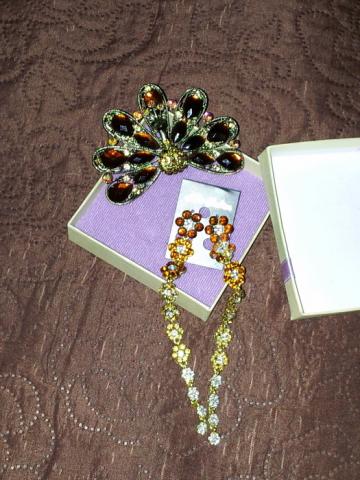 nuostabiai atrodantis komplektelis, ieina sage ir ilgi auskariukai, deveti tik karteli, auskaruose truksta dvieju akuciu, taciau nelabai matosi, galima isiklijuoti labai lengvai kitas tokios spalvytes akutes. auskariuku ilgis 12cm