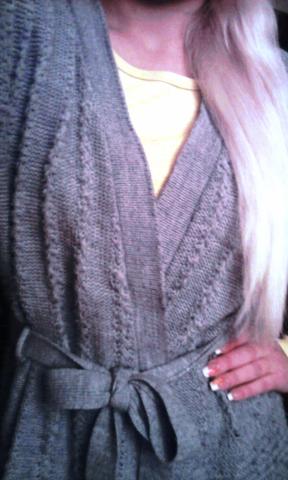 Labai gražus megztukas, trumpomis rankovėmis. Per juosmenį susijuosia dirželiu ir susiriša kaspinėliu. Pats laikas ruoštis šaltąjam metų laikui! : )