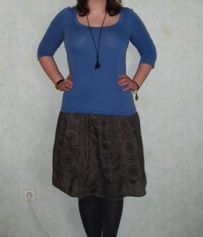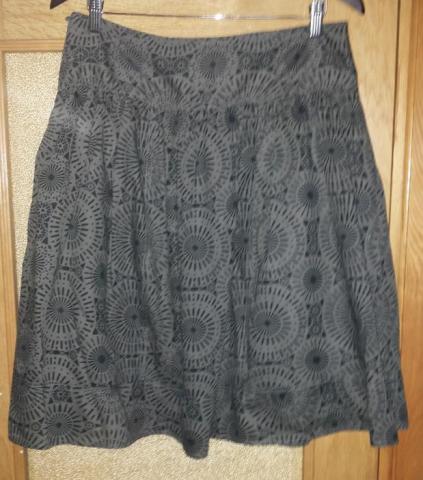 Pilkšvai ruda sijonas iki kelių su juodais raštais. Yra kišenės. Medvilninis. Su pamušalu. Iki kelių. Be defektų.