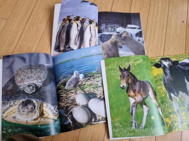 Nuostabios didelio formato kokybiškos gyvūnų fotografijos. Trys skirtingos knygos. Kiekvienos knygos priekyje - po truputį teksto, apie knygoje nufotografuotus gyvūnus. Kiekvienoje knygoje - po 40 psl.