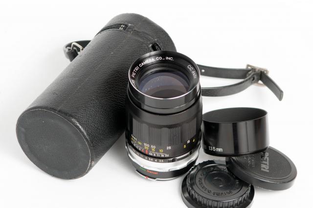 Petri veidrodiniam juostiniam fotoaparatui 3,5/135 Petri objektyvas. Būklė labai gera, be defektų. Komplekte dėklas, blenda, dangeliai.